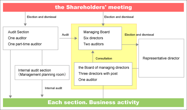- The Managing Board appoints the representative director as the chairman, and composes all members of the Board of Directors. The Managing Board is meets once a month, and a special meeting of the board is held at any time if as necessary. At the Managing Board, each director's business decisions are reviewed and supervised. Matters of weight within management are resolved there. Moreover, the auditor can give opinions by attending the Managing Board.